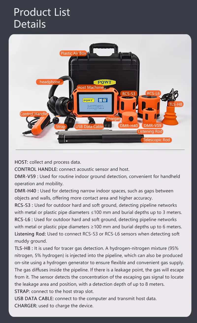 DMR-V59 sensor is suitable for indoor pipe leakage; RCS-S3 sensor locates metal or plastic pipes (<100mm) buried up to 3m deep on any ground;