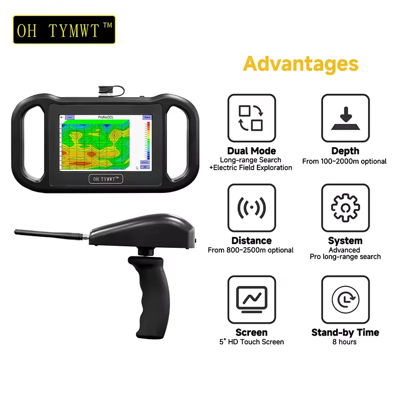 Long;range search instrument uses the geomagnetic field as the working field source and is based on the induced magnetic field generated by diferentmedla on the earth’s surace. it uses microcomputer processor control and reection conductivity for unit calbration, thereby achievine rapid scanning anddetection of water sources. Electritc field exploration uses natural electric fields as the working field source. it is an electrical exploration method that solves geological problems bymeasuring multiple electric field components ofnaturalelectric fields of iferent frequencies on the ground and analvzing abnormal changes caused by diferengeological structures based on the conductivity diferences of undereround rock mines or groundwater, The data colected by the instrument is pased Theinstrument’s uniaue bult.in calculation function enables automatic presentation of cuies and profles, Based on the profle, you can clearly understand thegeological laver structure and quickly determine specific information such as ore bodies (ore lavers, caves (cavities, water levels laquifersl. etc