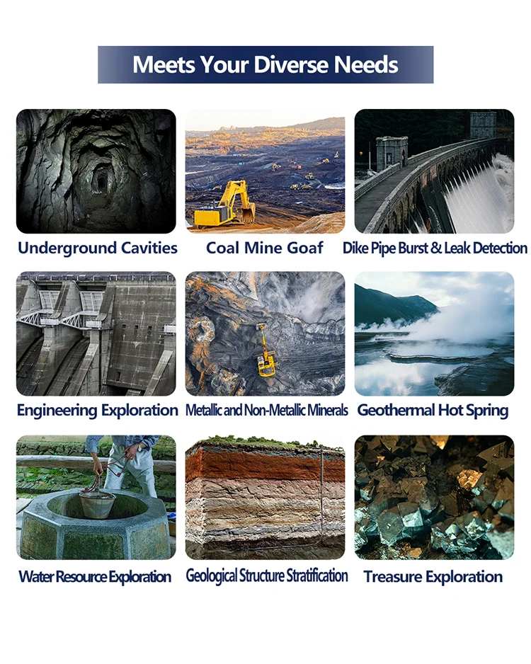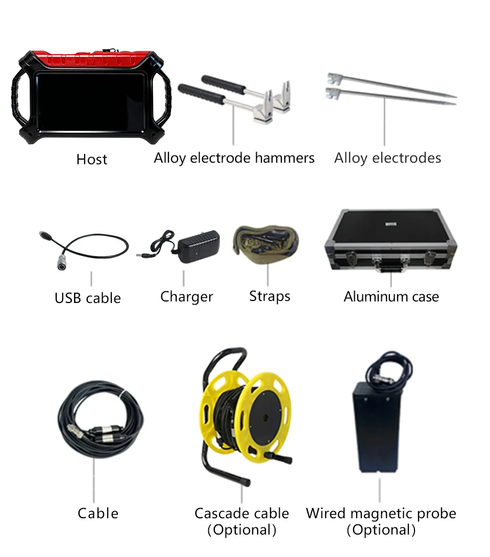Long;range search instrument uses the geomagnetic field as the working field source and is based on the induced magnetic field generated by diferentmedla on the earth’s surace. it uses microcomputer processor control and reection conductivity for unit calbration, thereby achievine rapid scanning anddetection of water sources. Electritc field exploration uses natural electric fields as the working field source. it is an electrical exploration method that solves geological problems bymeasuring multiple electric field components ofnaturalelectric fields of iferent frequencies on the ground and analvzing abnormal changes caused by diferengeological structures based on the conductivity diferences of undereround rock mines or groundwater, The data colected by the instrument is pased Theinstrument’s uniaue bult.in calculation function enables automatic presentation of cuies and profles, Based on the profle, you can clearly understand thegeological laver structure and quickly determine specific information such as ore bodies (ore lavers, caves (cavities, water levels laquifersl. etc