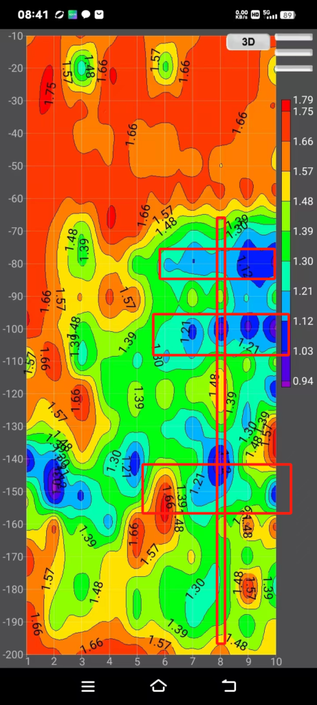 The measured resistivity profile is shown below. Specifically, the horizontal axis denotes point positions, and the vertical axis denotes depth. The contour map shows a red high-resistance layer between 10 and 70 meters, which we presume to be a shallow loose soil cover. This layer may contain a small aquifer, but it is primarily composed of weakly permeable materials. Notably, the first distinct layered blue-purple low-resistance zone starts at 70 meters, with an approximate thickness of 40 meters. Through analysis of the survey area’s hydrogeological data, we identify this low-resistance zone as either a sandstone pore water aquifer or a fracture water layer between sandstone and shale; it may also have hydraulic connections with surface water. In addition, a second low-resistance zone appears between 130 and 160 meters, likely a confined water layer about 30 meters thick. The resistivity of the surrounding rock in these low-resistance zones changes significantly. Therefore, if shallow drilling yields insufficient water, we recommend continuing drilling downward to penetrate the 160-meter-deep confined water layer.